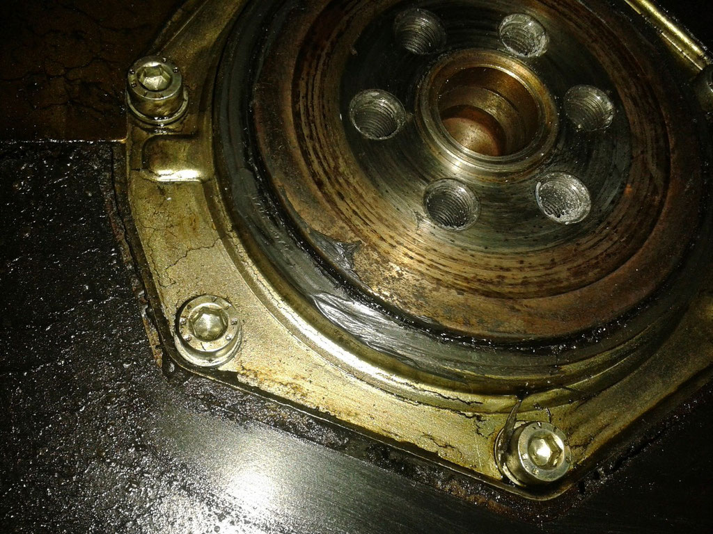 Cieknący uszczelniacz. Ktoś obsmarował uszczelniacz razem z wałem korbowym. Oczywiście nie miało to prawa działać. Uszczelniacz stoi w miejscu, a wał się obraca;) Pozdrawiamy tego naprawiacza!!!